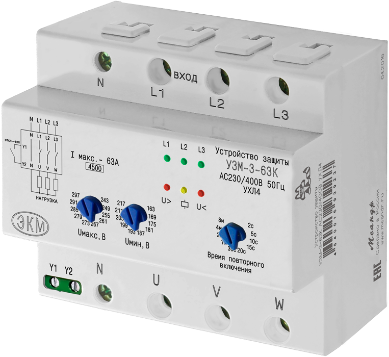 Реле контроля трехфазного напряжения УЗМ-3-63К предназначено для включения/выключения нагрузки при работе от автономного генератора, а также для защиты различного электрооборудования от аварий сетевого напряжения. Устройство не требует подключения внешних электромагнитных пускателей для коммутации. Устройство обеспечивает защиту оборудования (производственного, административного или жилого назначения) от разрушающего воздействия импульсных скачков напряжения, вызванных срабатыванием близкорасположенных и подключённых к этой же сети электродвигателей, магнитных пускателей или перепадов напряжения на ТП (Трансформаторной подстанции), предотвращая выход оборудования из строя. Варисторная защита каждой фазы обеспечивает сохранение работоспособности при воздействии импульсов перенапряжения длительностью 8/20мкс амплитудой до 6500А. Устройство не заменяет другие аппараты защиты (автоматические выключатели, УЗИП, УЗО и пр.). При кратковременном снижении сетевого