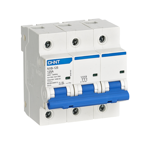 Модульные автоматические выключатели серии NXB-125 Предназначены для применения в сетях переменного тока напряжением 220/400 В частотой 50/60 Гц с номинальным током до 125 А для нечастых включений и отключений нагрузок, а также защиты от перегрузки и короткого замыкания в электроустановках жилых, общественных и промышленных зданий. Применимы в бытовых и аналогичных электроустановках, с доступом не обученного специально персонала. Основные характеристики: Номинальный ток – от 63 А до 125 А Исполнение по числу полюсов – 1Р , 2P , 3P , 4P Тип характеристики мгновенного срабатывания – С (8In ? 20%) , D D(12In?20%) Предельная отключающая способность – 10000 А Рабочая отключающая способность – 7500 А Механическая износостойкость – 20000 циклов В/О Электрическая износостойкость – 10000 циклов В/О Категория применения – A Класс токоограничения – 3 Степень загрязнения – 2 Степень защиты – IP20 Ширина полюса – 18 мм Монтаж – на симметричную DIN-рейку 35 мм Подключение – кабелем, шины типа PIN и FORK Сигнализация – окош