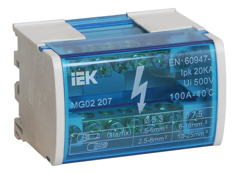 Шины выполнены из высококачественной латуни, изолирующая задняя панель и прозрачная защитная крышка выполнены из самозатухающего пластика.