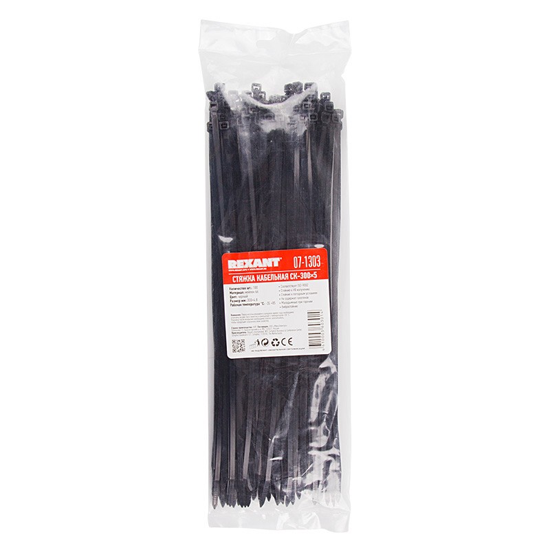 Хомут нейлоновый (кабельная стяжка) предназначен для крепления или обвязки в жгут кабелей и проводов. Применяется для крепления гибких гофротруб и других предметов к несущей поверхности. Используется в быту, а также при проведении электромонтажных работ. Стяжка 300x4,8мм черного цвета изготовлена из кристаллизующегося конструкционного материала – полиамида, который имеет высокую твердость, механическую прочность и отличается высокими электроизоляционными свойствами. Обладает высоким сопротивлением к различным основаниям, маслам, смазочным материалам и хлоридным растворителям. Монтаж изделия может выполняться вручную или с помощью специального пистолета