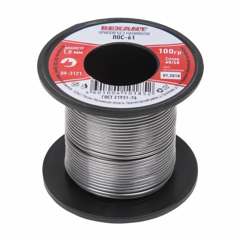 Припой в катушке ПОС-61 Ø1,0 мм (без канифоли) REXANT предназначен для создания механически прочного и герметичного соединения деталей между собой или для их фиксирования на плате (пайка и лужение радиоэлектронных приборов, медицинской аппаратуры, автодеталей, печатных плат, электроаппаратуры и т.д.).