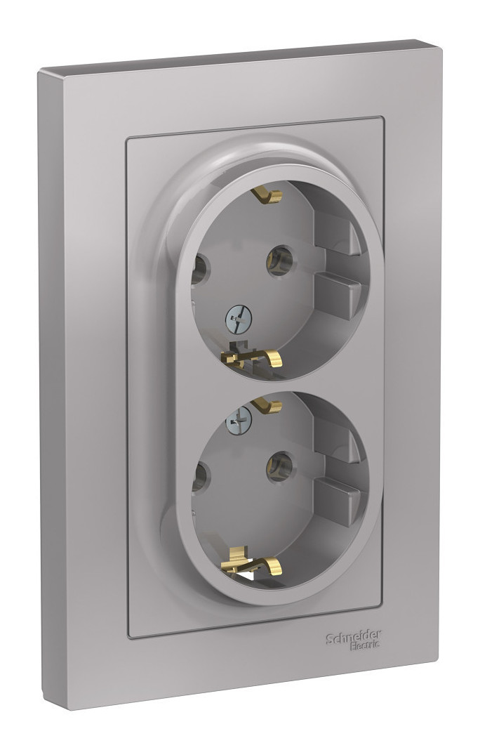 Розетка двойная Schneider Electric AtlasDesign (в сборе, цвет алюминий) с заземлением, без шторок подходит для сетей 250 В, на ток 16 А.- Заземляющий контакт обеспечивает дополнительную защиту от удара электрическим током.- Лицевые детали из качественного ABS-пластика, устойчивого к царапинам и УФ-излучению.- Двойная розетка позволяет подключить два устройства в одном месте.