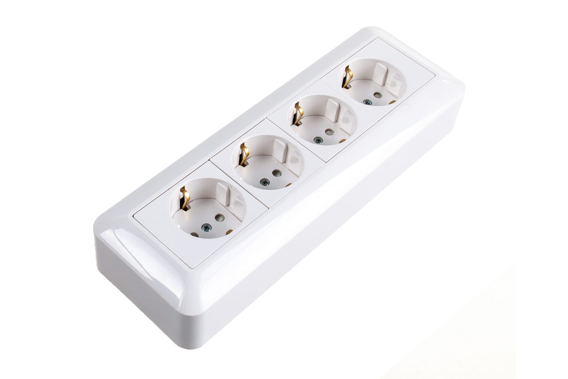 Розетка четырёхместная Schneider Electric ПРИМА (открытой установки, цвет белый) с заземлением и со шторками, с монтажной стальной пластиной предназначена для сетей до 250 В на ток до 16 А. - Четырёхместная розетка позволяет подключить четыре устройства в одном месте. - Заземляющий контакт обеспечивает дополнительную защиту от удара электрическим током. При наличии заземления электрический потенциал уходит в землю, защищая человека.