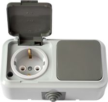 Блок выкл. 1 клав. + розетка (открытая, с/з, брызг. защ.) серая, Пралеска Аква В-РЦ-657(03)
