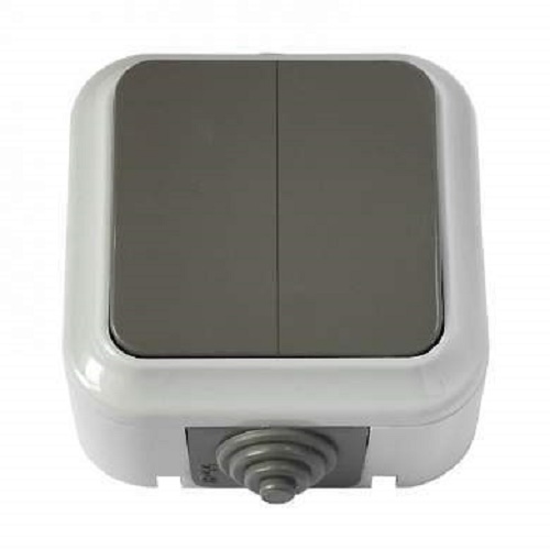 Выключатель двухклавишный для открытой установки брызгозащищенный серый,напряжение 250 В,частота тока 50 Гц,номинальный ток 6 А,УХЛ4,IP54,сечение проводников от 1,00 до 2,50 мм?,установочные размеры (расстояние между отверстиями под шурупы) 53±0,2 мм,габаритные размеры 70х70х40,5 мм