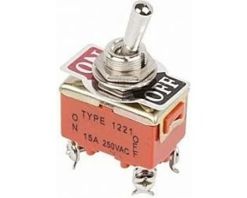 умблер 250V 15А (4c) ON-OFF двухполюсный предназначен для коммутации электрических цепей переменного тока напряжением до 250В. Такая разновидность переключателей применяется на лицевых панелях в качестве комплектующих изделий различного электрооборудования (в измерительных приборах, блоках питания, электроустановках на различных производствах, легковых и грузовых автомобилях, поездах и многих других местах). Отличительной особенностью тумблера является перекидной переключатель, принцип действия которого основан на его перемещении в одну из позиций. Для переключения в нужное положение требуется приложить некоторые усилия. Монтаж осуществляется без применения винтов на плоских панелях толщиной от 0.8мм до 4мм. Подключение контактов осуществляется с помощью винтов.