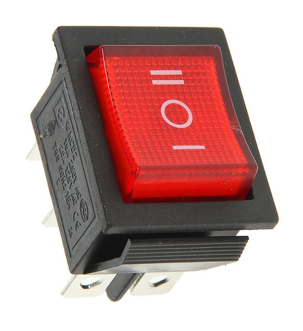 Выключатель клавишный 250V 15А (6с) ON-OFF-ON красный с подсветкой и нейтралью предназначен для коммутации электрических цепей переменного тока напряжением до 250В. Клавишные (Рокерные) выключатели применяются в качестве комплектующих изделий различного электрооборудования (в сетевых фильтрах и удлинителях, аудио-оборудовании, блоках питания, электроустановках на различных производствах, автомобилях, и многих других местах). Такой клавишный переключатель имеет три положения. Принцип действия основан на перемещении клавиши в одну из позиций. Для переключения в нужное положение требуется приложить некоторые усилия на клавишу. Монтаж осуществляется без применения винтов на плоских панелях толщиной от 0.8мм до 3мм. Подключение контактов осуществляется плоской клеммой 6.6мм, либо с помощью пайки.