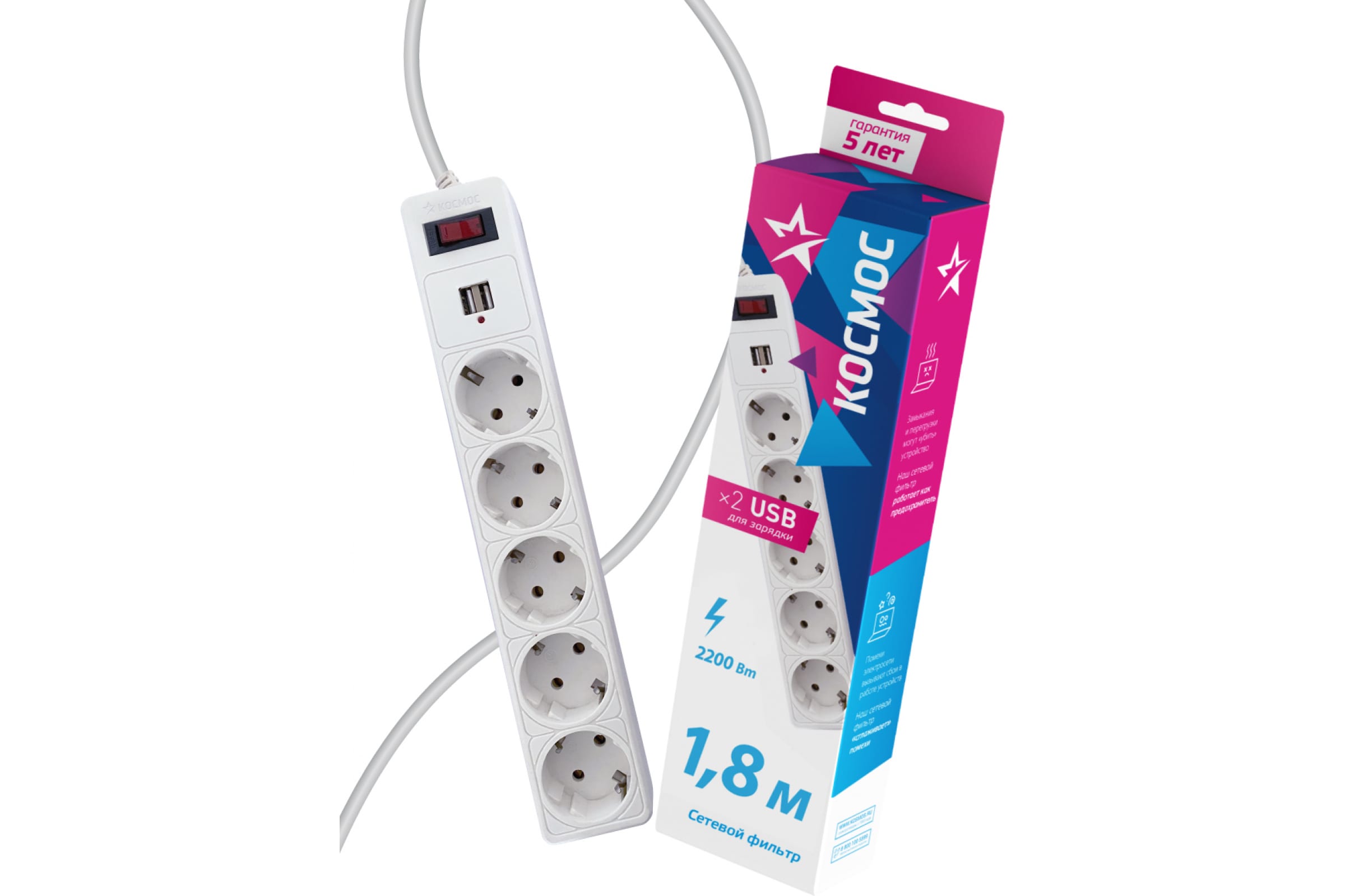 Сетевой фильтр Космос 5гн*1,8м (ПВС 3*075) белый FKsm1,8m-5g(W) 44929