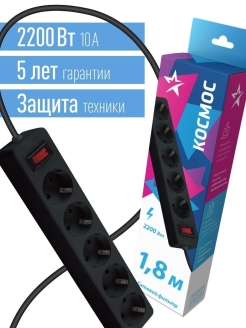 Сетевой фильтр Космос защищает устройство от выхода из строя из-за " некачественного" тока: защита от перегрузок и замыканий многоразовой автоматикой. Защита импульсных помех часто встречающихся в бытовой электросети. Лучше всего подходит для подключения чувствительной электроники:компьютеров,телевизоров,стереосистем и т.д.Максимальная мощность 2200 Вт, что достаточно для одновременного подключения двух ноутбуков, телевизора,игровой приставки и любого мощного устройства.100% медный трехжильный кабель с сечением 0,75мм, пожаробезопастный корпус. Индикатор сети. Номинальный ток 10А.