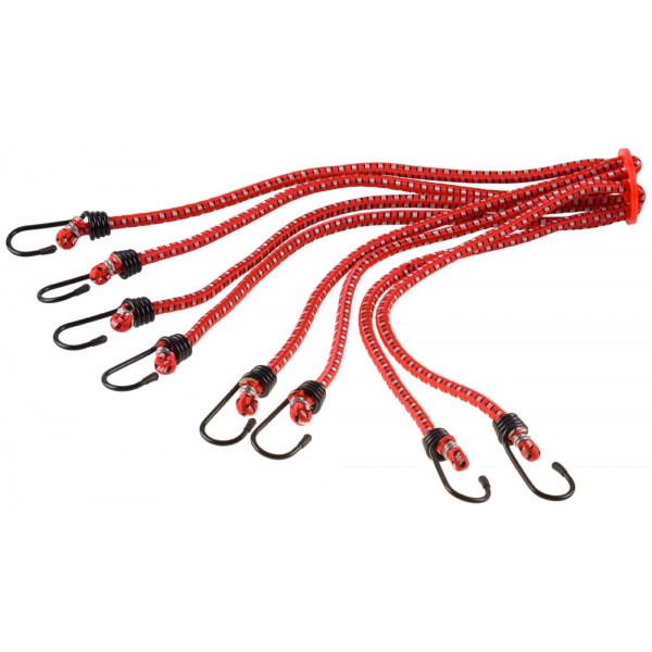 Стальные крюки с пластиковыми защитными наконечниками надежно закреплены на шнуре; Шнур диаметром 8мм состоит из множества эластичных жил; 8 крюков позволяют надежно зафиксировать разнообразный груз для транспортировки