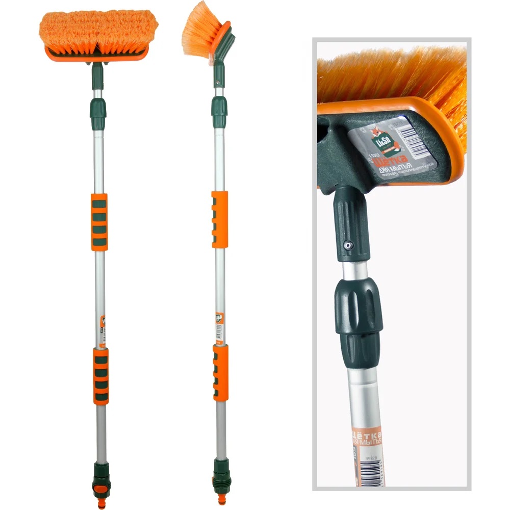 Проточная щетка для мытья оснащена телескопической ручкой. Расщепленная щетина обеспечивает тщательную и качественную мойку.Для удобства использования ручка оснащена двумя поролоновыми противоскользящими накладками и клапаном для подачи воды.Длина 94-160 см.