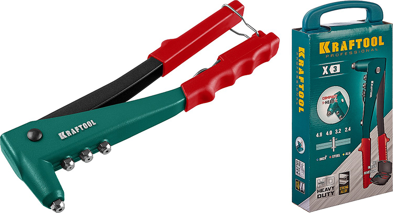 Заклепочник KRAFTOOL выдерживает высокие рабочие нагрузки и предназначен для установки заклепок из алюминия, стали и нержавеющей стали различных диаметров согласно таблице