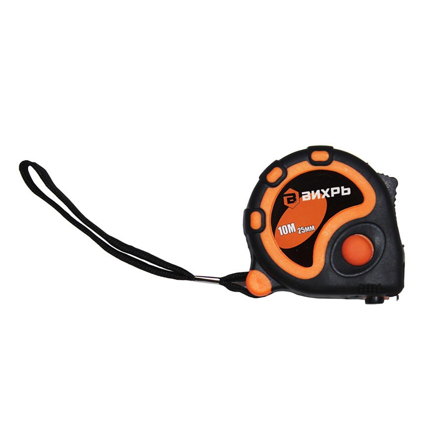 Рулетка измерительная ВИХРЬ 10мх25ммизготовлена из ударопрочного пластика с прорезиненным покрытием, защищающим ее от повреждений. Измерительная лента из высококачественной стали с нейлоновым покрытием обеспечит долговечность и стойкость к истиранию шкалы. Есть фиксатор механизма сматывания полотна. Также предусмотрен ремешок для переноски на руке. Длина ленты 10 метров, ширина 25 мм.