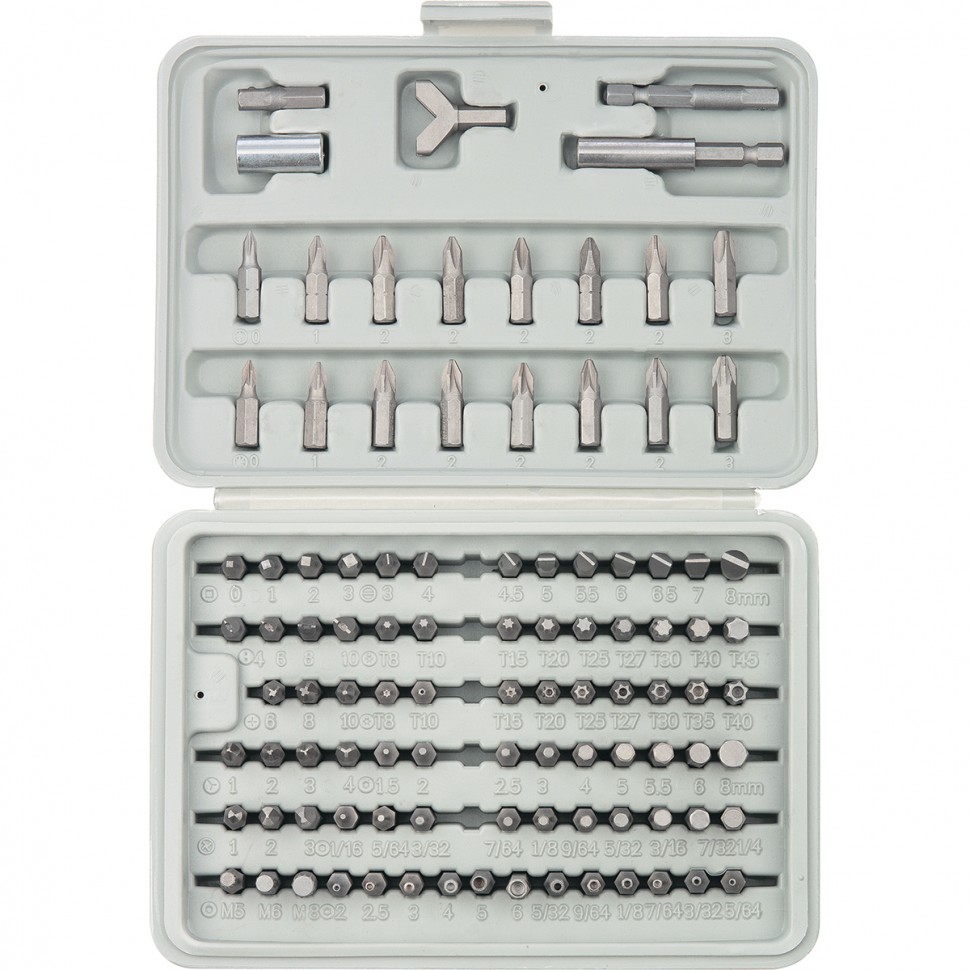 Набор SPARTA 113975 включает в себя сменные отверточные биты, адаптеры и держатель для бит. Принадлежности используются для монтажа/демонтажа крепежных элементов различного профиля. В комплектацию входят биты с рабочим профилем - прямой шлиц (3 – 8 мм), Phillips (№ 0 - №3), Pozidriv (№0 - №3), Torx (T8 - T45), шестигранник (1,5 – 8 мм; 1/16” - 1/4”), Tri-Wing (№1 - №4), Torq-Set (№6 - №10), Spline (№5 - №8). Насадки изготовлены из хром-ванадиевой стали, отличаются высокой прочностью, а также устойчивостью к коррозии и износу. Набор поставляется в пластиковом боксе, что обеспечивает удобное хранение.