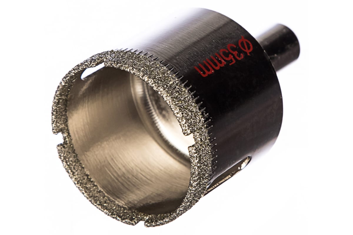 Коронка алмазная "Rennbohr" используется для сверления керамогранита, керамической плитки, изделий из керамики. Тонкая режущая кромка для быстрого и чистого сверления. Алмазное покрытие и перфорированный наконечник обеспечивает долгий срок службы при обработке самой твердой керамической плитки и керамогранита. Диаметр 35 мм. Коронки диаметром 16-120 мм имеют направляющее твердосплавное сверло для точного сверления без отклонений. Запрещено работать в ударном режиме и без охлаждения водой, а так же рекомендуется ограничивать скорость подачи и частоту оборотов, чтобы избежать перегрева.