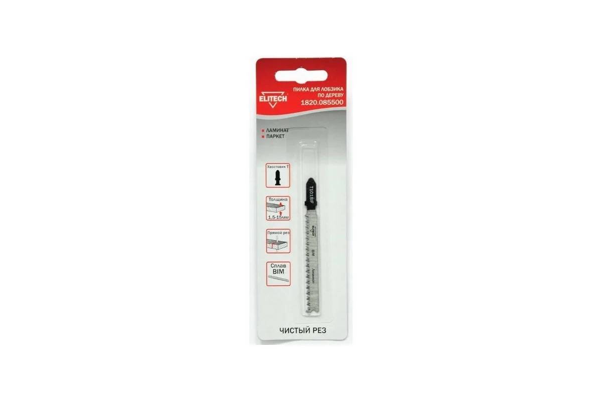 Полотно пильное Elitech 1820.085500 совместимо с электрическим лобзиком. Модель прочно крепится к строительному инструменту посредством хвостовика типа Т.