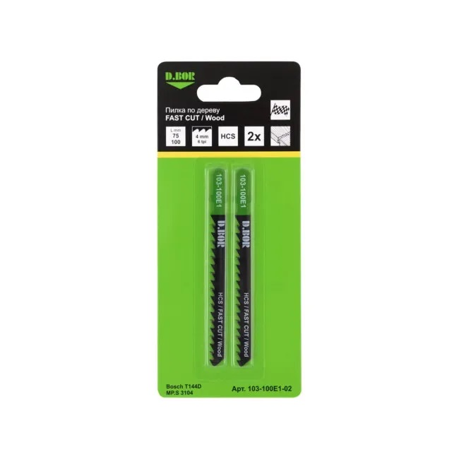 Полотна для электролобзика D.BOR (арт. D-103-100E1-02) линии FAST CUT имеют общую длину 100 мм, длину рабочей части 75 мм, толщину 1.2 мм, крестообразно шлифованные, разведённые зубья с шагом 4 мм, хвостовик Т, произведены из высокоуглеродистой стали HCS, предназначены для прямолинейного быстрого реза мягкой древесины и волокнистых плит толщиной 5-50 мм, поставляются в упаковках по 2 шт. Могут использоваться для установки на электролобзики различных производителей - Hikoki, ЗУБР, ИНТЕРСКОЛ, Metabo и других.