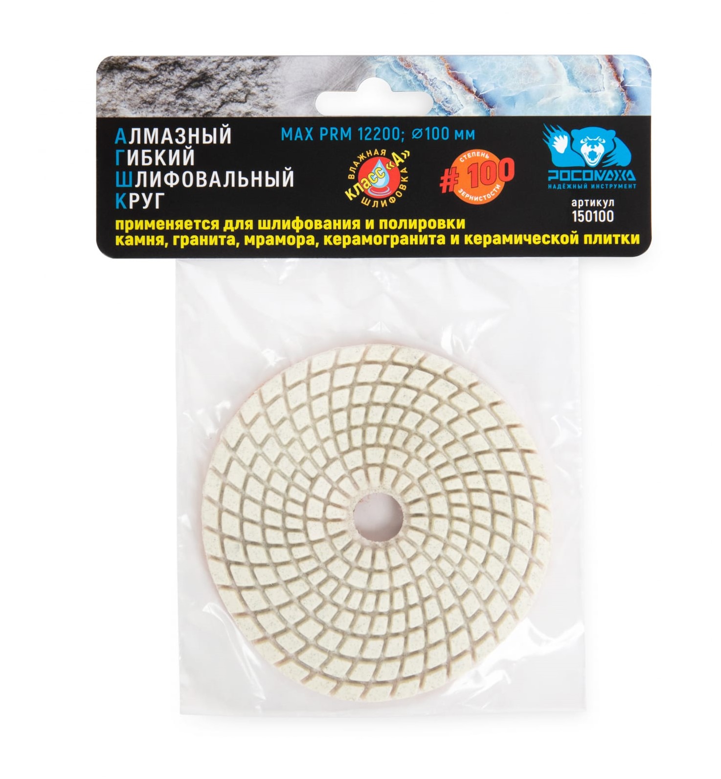 Круг шлифовальный РОСОМАХА 100мм зерно 100 предназначен для мокрой полировки и шлифовки поверхностей любых видов натурального и искусственного камня, гранита, мрамора, керамогранита и керамической плитки.