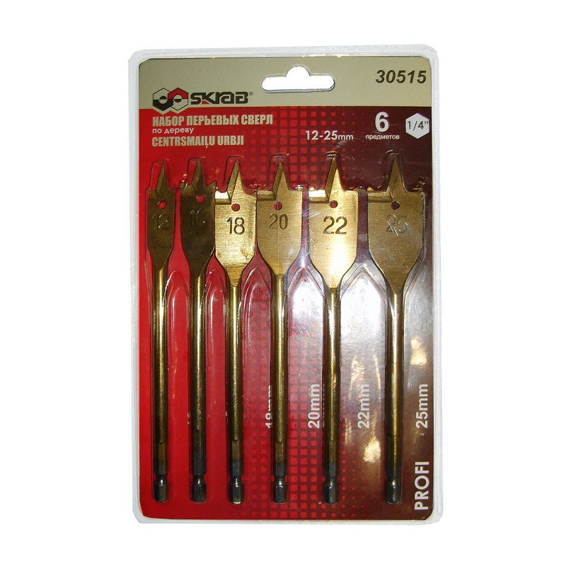 Набор SKRAB 30515 состоит из 6 перьевых свёрл по дереву длиной 150 мм: 12; 16; 18; 20; 22; 25 мм. Сверла изготовлены из инструментальной высокоуглеродистой стали с пескоструйной обработкой поверхности, имеют нитридтитановое покрытие. Хвостовик имеет шестигранный профиль диаметром 6,35 мм и предназначен для надежного фиксирования сверла в патроне дрели, шуруповёрта или сверлильного станка.