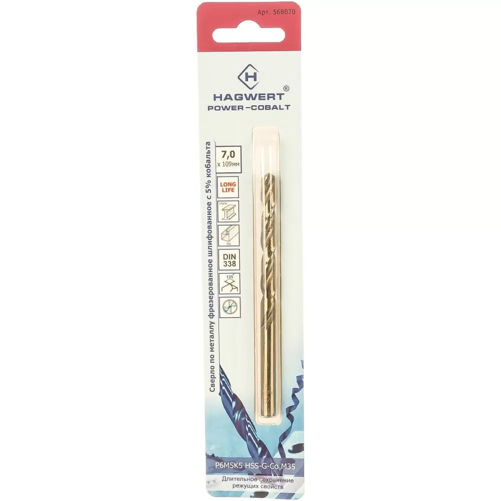 Сверло по металлу Power-Cobalt Hagwert 568070 применяется для получения сквозных и глухих отверстий в металлических заготовках. Изготовлено из высококачественной быстрорежущей стали, легированной кобальтом Р6М5К5/М35 (6 % вольфрама, 5% молибдена, 5% кобальта). Сверло предназначено для работ повышенной сложности. Выполнено согласно ГОСТ 10902-77. Возможно сверление отверстия глубиной в 4 диаметра без вывода сверла для удаления стружки. Заточка Split Point позволяет засверливать без накернивания. Поставляется в индивидуальной упаковке.