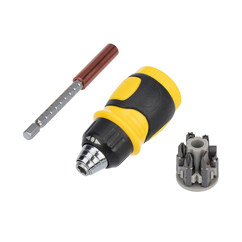 Набор бит с реверсивной отверткой REXANT 8 в 1 применяется для монтажа и демонтажа винтов, шурупов, саморезов и других крепежных изделий. Намагниченные насадки выполнены из качественной хромованадиевой стали. Двухкомпонентная прорезиненная рукоятка не скользит в ладони и обеспечивает дополнительный комфорт при работе. В основании отвертки предусмотрен бокс для хранения насадок. Реверсивный механизм срабатывает как по часовой стрелке, так и против часовой стрелки, а также имеет фиксацию положения.В наборе поставляются биты: T3.0, T2.5, SL6, SL5,PH1, PH2.