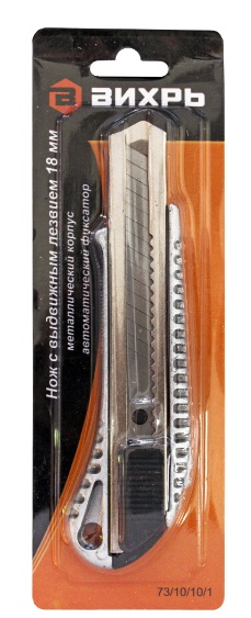 Нож Вихрь имеет металлический корпус, автоматический фиксатор лезвия и оснащен металлической направляющей лезвия, что повышает прочность ножа при давлении на него во время резки.