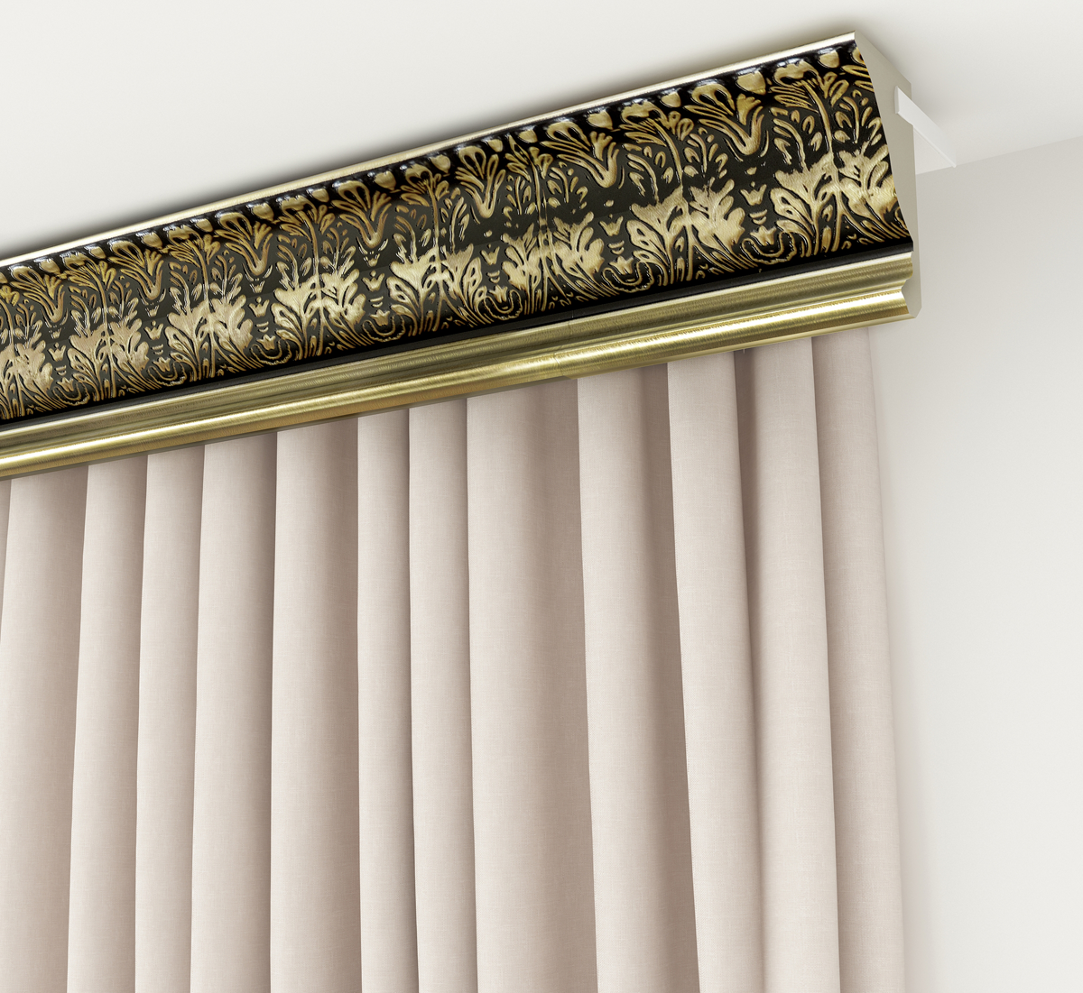 Основа карниза - пластиковая потолочная шина, декоративный элемент -багетная планка из полимерного материала.