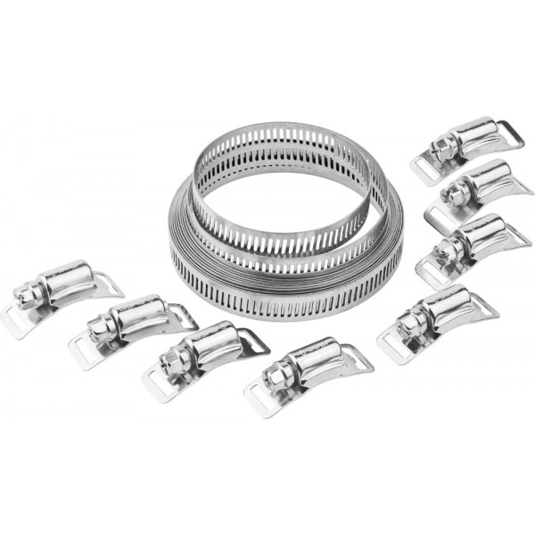 Комплектность набора позволяет создавать червячные хомуты любого диаметра; В комплект набора входят нержавеющая просечная лента 12,7 мм х 3 м и 8 универсальных замков; Собранные с помощью набора хомуты обладают следующими характеристиками: * Простота и удобство монтажа - для монтажа достаточно отвертки; * Повышенная прочность и коррозионостойкость благодаря нержавеющей стали; * Бытово