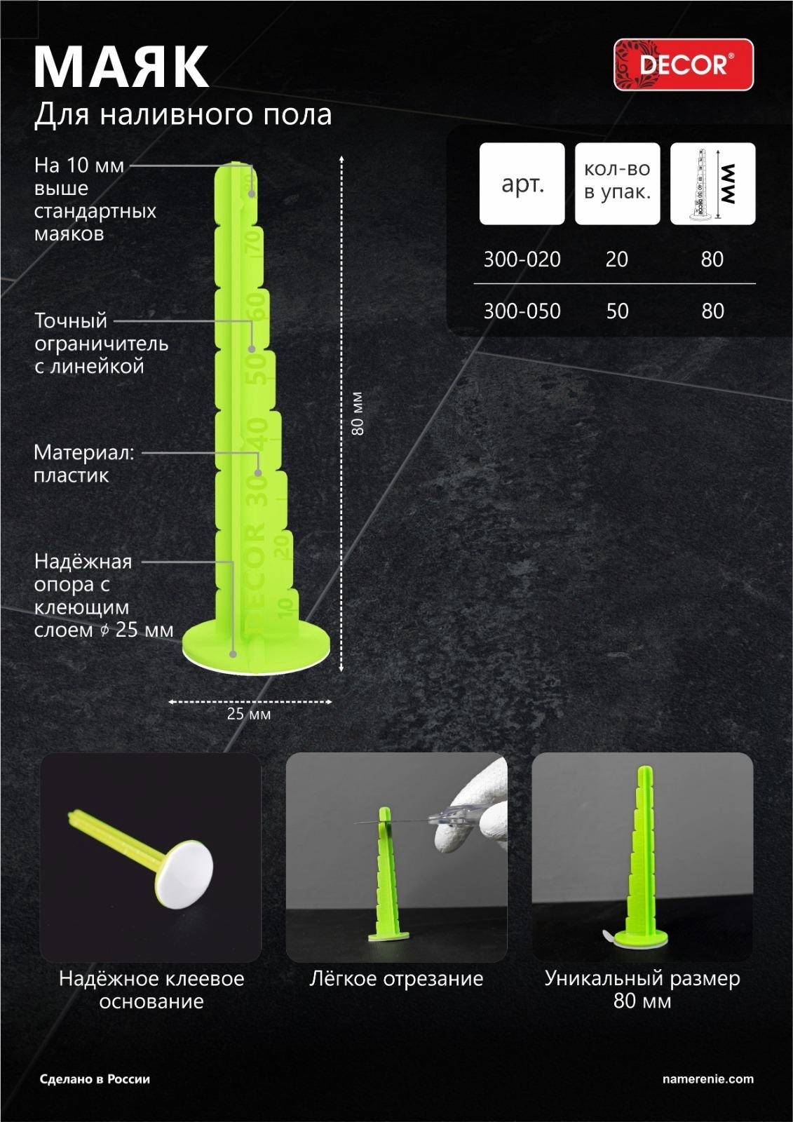 Маяк для наливного пола DECOR высотой 80 мм — это незаменимый инструмент для создания идеально ровного пола. Он обеспечивает точное позиционирование и контроль уровня заливки, что особенно важно при проведении ремонтных и строительных работ. Благодаря маякам вы сможете добиться профессионального результата даже без специального опыта. Маяки DECOR отличаются высоким качеством и надёжностью. В упаковке 50 штук, что позволит вам провести работы на значительной площади. Высота маяка в 80 мм подходит для большинства типов наливных полов и обеспечивает удобство в работе. Использование маяков упрощает процесс заливки и помогает избежать неровностей и бугорков на поверхности пола.