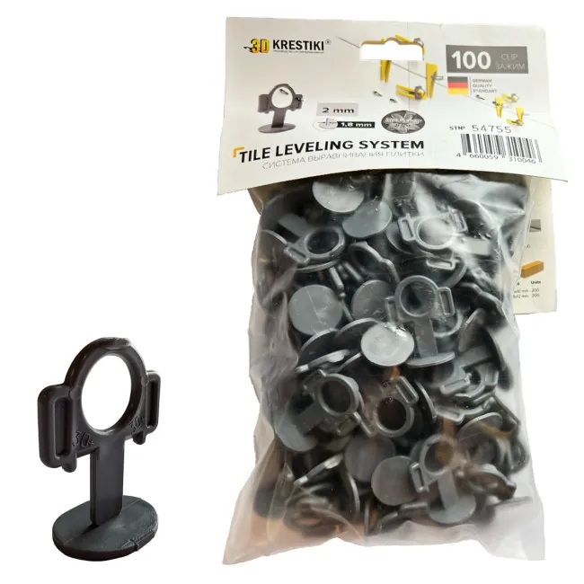 Зажим 3D Krestiki Strong - неотъемлемая часть системы выравнивания плитки (СВП), состоящей из зажимов и клиньев. Использование СПВ значительно упрощает и ускоряет процесс укладки плитки. Подходит для керамической и клинкерной плитки, керамогранита. К несомненным преимуществам применения СВП стоит отнести, прежде всего, выравнивание двух смежных плиток по одному уровню - при укладке на пол не будет перепада высот, при укладке на стены - характерных "волн", предотвращается появление пустот в клеевом слое, кроме того, при высыхании клея плитку не поведёт.