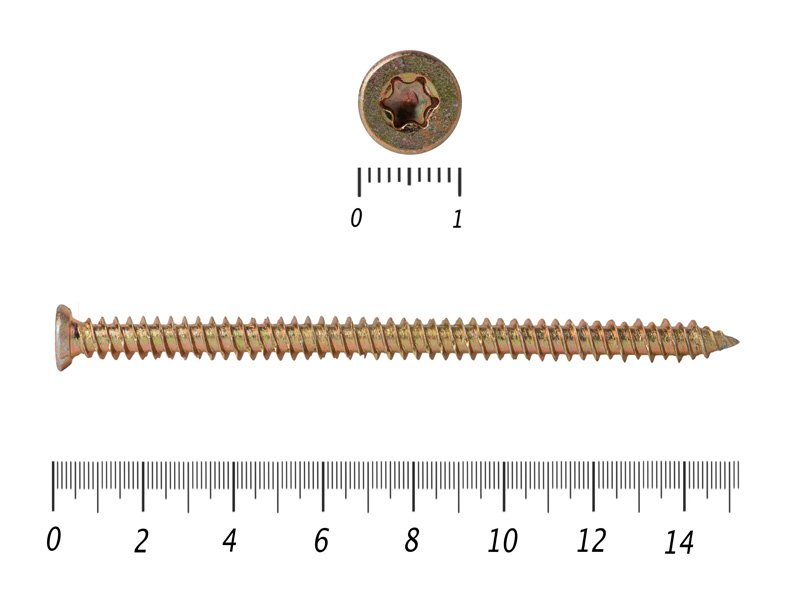 Длина - 152мм Диаметр - 7,5мм Головка - потайная с насечками для раззенковки Шлиц - Тоrх №3 Резьба - частый шаг Наконечник – острый Материал - сталь С1022