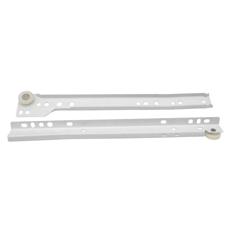 Направляющие роликовые для мебельных ящиков. Выдвижной механизм одинарный, неполного выдвижения, с самозатягиванием, двойным остановом и защитой от выкатывания. Несущая способность (на пару) до 20 кг. Ширина направляющей 0,9 см, толщина профиля с покраской 1 мм. Длина направляющей 30 см, Цвет белый.