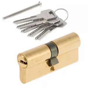 Латунный цилиндровый механизм с 5 английскими ключами. Ключи из латуни. Крепежный винт в цвет цилиндра. В закрытом состоянии поводок отклонен на 30 градусов, что обеспечивает дополнительную защиту от выбивания. 5 пинов, цилиндр ключ-ключ, размер 80мм (40*40)
