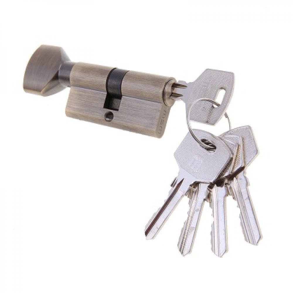 Латунный цилиндровый механизм с 5 английскими ключами. Ключи из латуни. В закрытом состоянии поводок отклонен на 30 градусов, что обеспечивает дополнительную защиту от выбивания. 5 пинов, цилиндр ключ-вертушка, размер 70мм (35*35)