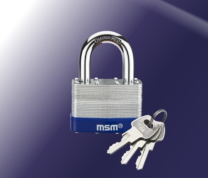 Замок навесной, шириной 50мм, высотой 74мм и стальной закаленной дужкой диаметром 8,8мм. Замок изготовлен из наборных, стальных оцинкованных пластин, имеет автоматическое запирание, комплектуется тремя английскими ключами, упакован в блистер.