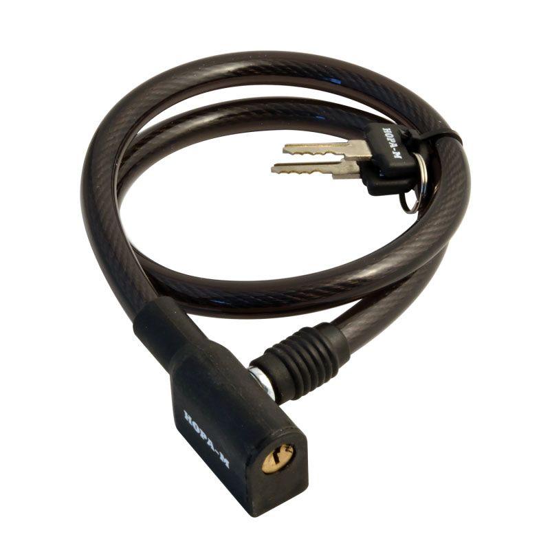 Стальной трос, заключенный в пластиковый кожух, и оснащенный замковым механизмом.