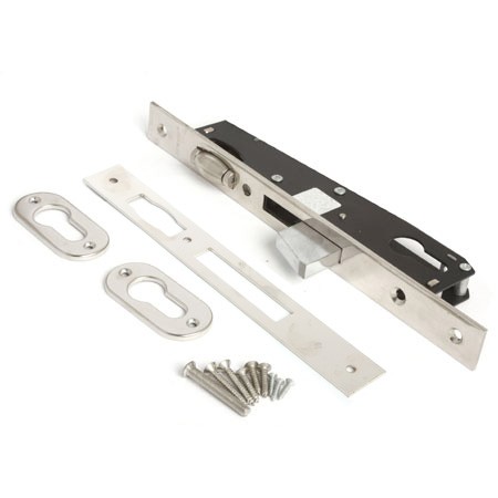 Врезной замок для дверей из алюминия и ПВХ профиля. Защелка роликовая. Тип ригеля - падающий Ширина лицевой планки: 23мм. Дина - 238мм. Удаление ключевого отверстия: 25 мм. Цвет лицевой планки: никель. Не комплектуется цилиндром.