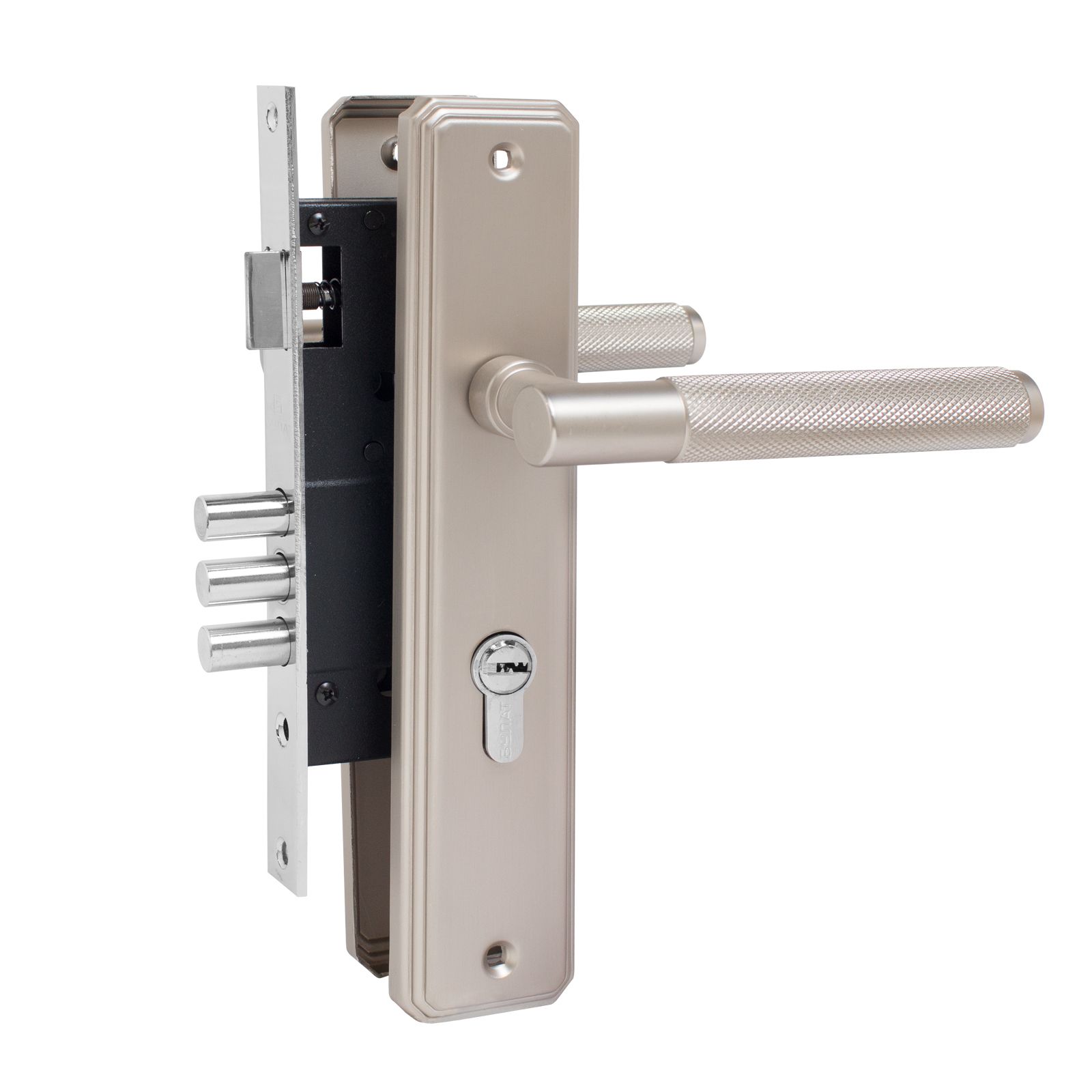 Замок врезной с ручками. Предназначен для установки в деревянные двери толщиной 35-45 мм, правого и левого открывания. Дверь может быть закрыта на защелку и открыта с помощью фалевой ручки при открытом засове замка. Три круглых стальных ригеля диаметром 12 мм. Универсальная защелка. Стальной корпус покрыт полимерной краской. Межосевое расстояние 70 мм. Удаление ключевого отверстия 45мм. Материал ручек - сталь. Комплектация: латунный цилиндровый механизм 62мм, 5 перфоключей, ответная планка, винтовые стяжки.