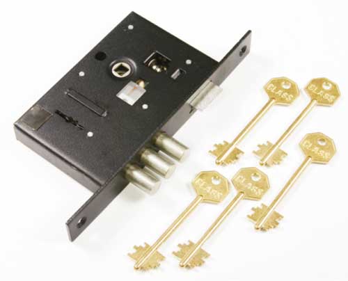 Размещение сувальд в 2-х кассетах (по 6 шт), 3-ех ригельный засов, ригель Ф12мм, вылет засова 22мм за 2 оборота, с защелкой и фалевыми ручками, толщина корпуса 21мм, комплект из 5 ключей