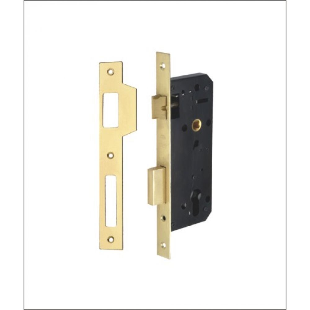 Цилиндровый замок с защелкой, универсальный (защелка переворачивается при вдавливании в корпус и поднятии флажка), с ответной планкой. Защелка открывается от ключа и ручек. Межосевое расстояние 85мм, удаление ключевого отверстия 45мм. В корпусе предусмотрены отверстия для крепления брони и крепления раздельных ручек стяжками. Цилиндровый механизм и ручки не входят в комплект.