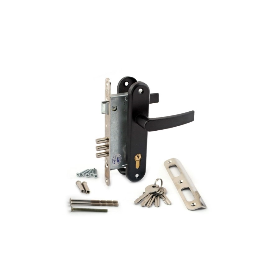 Описание: Универсальный 3-х ригельный врезной замок для дверей толщиной 40-50 мм с защелкой и ручками для дверей. Защелка открывается только ручкой. Имеет антикоррозийное покрытие, не требующее смазки при эксплуатации. Комплектуется цилиндровым механизмом типа МЦ1-6 60м. Удаление ключевого отверстия (backset)- 52,2мм без учета лиц.планки/ширина лиц.планки 2,5мммм Межцентровое расстояние 85 мм. Габаритные размеры 160х82х15 мм.