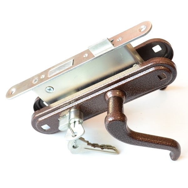 Замок для деревяных дверей. 4 ключа. Накладка крепится двумя стяжными винтами изнутри. Межосевое расстояние 55 мм. Растояние до цилиндрического мех-ма 55мм. Габариты:В-130,В планки 200,Ш-85,Т-15