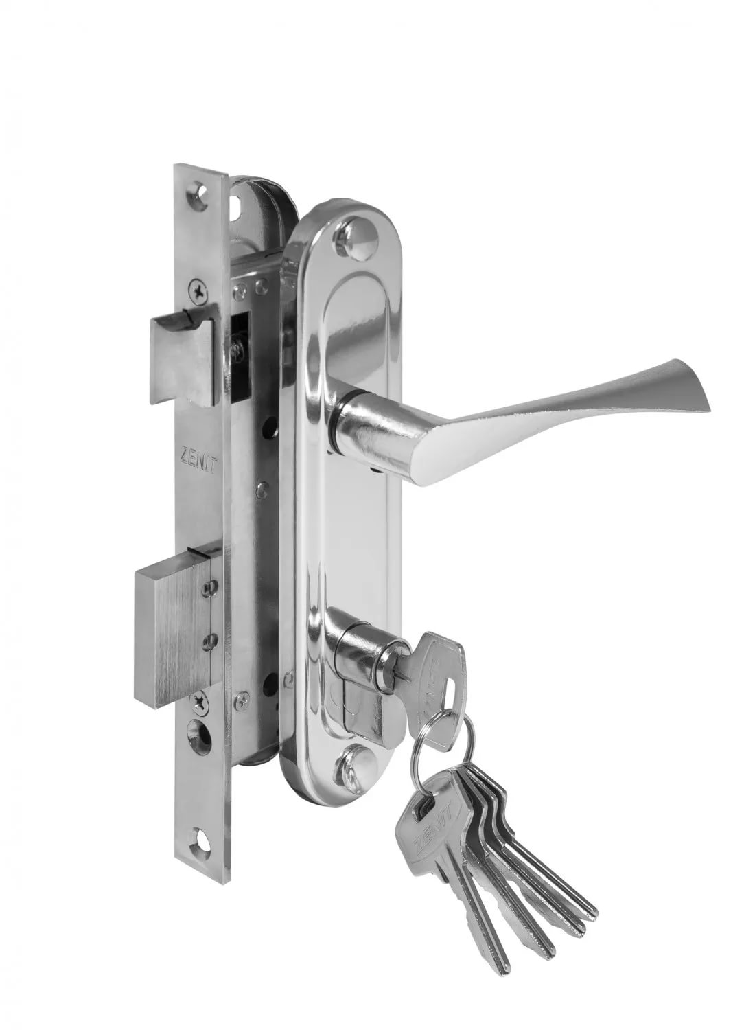Замок врезной с защелкой 2 класса универсальный, предназначен для установки на левые и правые двери толщиной 35-45мм. Межосевое расстояние 70мм, удаление ключевого отверстия 40мм. Комплектуется ручками на стяжках, ответной планкой и цилиндровым механизмом типа МЦ1-5 70мм с пятью английскими ключами.