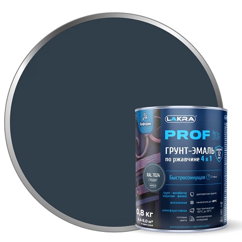 Быстросохнущая, всесезонная (-30°С), гладкая.Атмосферостойкая гладкая грунт-эмаль «4 в 1», сочетающая в себе свойства преобразователя ржавчины, антикоррозионного грунта, декоративной эмали, а также обладающая передовыми потребительскими свойствами – нанесение до -30°С, быстрое время высыхания и возможность колеровки. Для внутренних и наружных работ Преобразователь ржавчины, антикоррозийный грунт, декоративная гладкая эмаль Всесезонная, нанесение от -30°С до 40°С Атмосферостойкая, эксплуатация в интервале температур от -60°С до 60°С Высокая адгезия к основанию Останавливает развитие коррозии и обеспечивает долговременную защиту Быстро сохнет - 2 часа Колеровка компьютерная по системе PARADE или вручную Сертифицирована для применения в детских и лечебных учреждениях