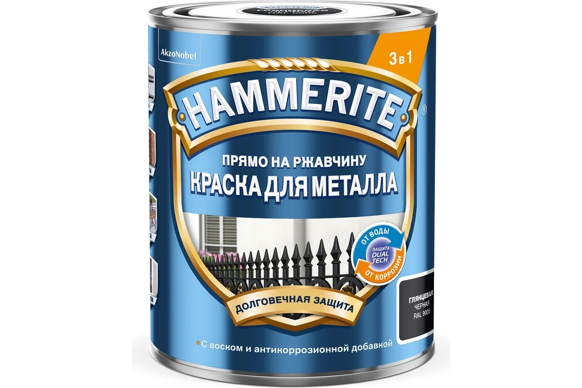 Краска по ржавчине Hammerite с формулой 3в1 (грунт, ингибитор коррозии, финишное покрытие) легко и быстро защищает металл от ржавчины. Технология Dual Tech с добавлением воска обеспечивает металлу двойную защиту от воды и коррозии. Краска укрывистая, образует прочное и эластичное покрытие, стойкое к бытовым химикатам, бензину и маслам (при их кратковременном воздействии), а также перепадам влажности и температуры. Содержит силиконовые добавки, которые усиливают грязе- и водоотталкивающие свойства покрытия. Быстро сохнет, позволяя провести окрашивание за день. Термостойкость покрытия до +80°С.
