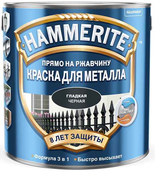 Грунт-эмаль по ржавчине Hammerite— это краска для металла, которая защищает от ржавчины и придает красивый внешний вид поверхности. Она создает прочный барьер, который предотвращает дальнейшее распространение ржавчины и коррозию металла. Покрытие устойчиво к ультрафиолетовым лучам, влаге и перепадам температур, что обеспечивает долгий срок службы. Время высыхания краски составляет всего 4 часа, что позволяет быстро закончить работу и приступить к следующим этапам отделки. ### Особенности: - краску можно наносить кистью, валиком или краскопультом, что делает процесс окрашивания удобным и быстрым; - подходит для различных типов металлических поверхностей, включая черные металлы, сталь, чугун, алюминий и другие; - одного литра краски хватает на 10 квадратных метров при нанесении в один слой, что позволяет сэкономить деньги и время на покупку дополнительных материалов; - создает абсолютно гладкую поверхность; - цвет — графит; - объем — 0,75 л.