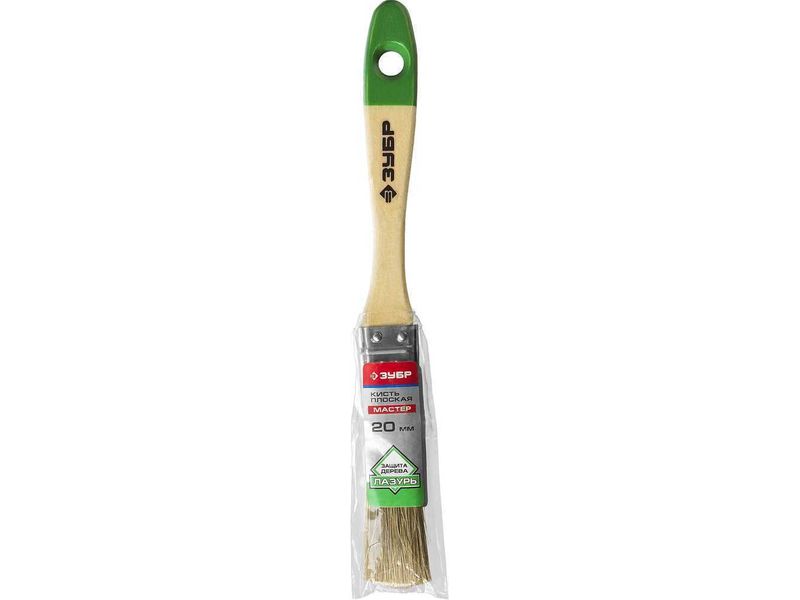 Ручка оснащена отверстием для осуществления подвешивания, упрощающим хранение и сушку данной модели. Бандаж кисти, закрепляющий щетину, изготовлен из высококачественного металла, что обеспечивает прочное соединение и длительный срок эксплуатации инструмента. Плоская кисть ЗУБР "ЛАЗУРЬ-МАСТЕР" является универсальным инструментом, предназначенным для осуществления разнообразных работ с сильнотекучими лакокрасочными материалами, в особенности со средствами для защиты дерева, такими как: морилка, пропитка. Рукоятка кисти сделана по современным технологиям из древесины высокого качества и отличительной прочности - это прекрасно способствует увеличению срока службы данного изделия. Отличительным качеством рабочей части инструмента является смешанная щетина, которая хорошо впитывает и удерживает, а также обеспечивает равномерное распределение лакокрасочных материалов. Небольшой вес кисти гарантирует меньшее утомление при выполнении работ.
