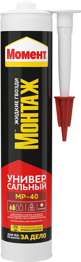 Момент Монтаж Универсальный МР-40 для общестроительных внутренних и наружных работ. Применяется при установке молдингов, подоконников, дверных и оконных рам, приклеивании керамической плитки и других декоративных и строительных материалов. Склеивание можно производить при температуре отс -10°C дос +45°C.
