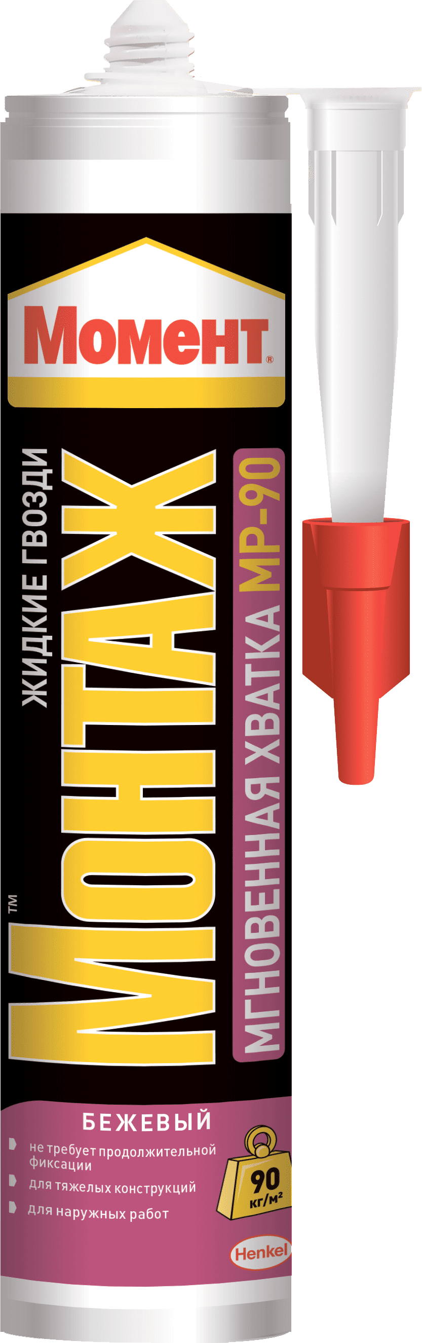 Момент Монтаж Мгновенная хватка МР-90 обеспечивает высокую первоначальную силу схватывания уже с первых секунд после соединения склеиваемых деталей. Применяется в местах, где необходимо особо прочное крепление деталей с момента соединения. Совместим с большинством строительных материалов. Склеивание можно производить при температуре от -10°C до +35°C.