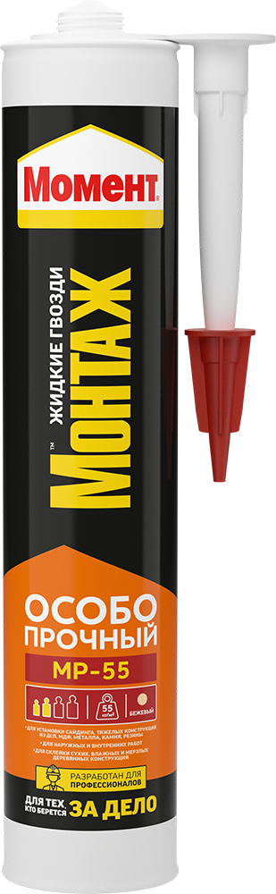 Момент Монтаж Особопрочный МР-55 для быстрого и надежного крепления тяжелых конструкций, требующих высокой прочности и долговечности. Незаменим при установке наружной обшивки, сайдинга, кровли, черновых полов, каменной облицовки, стеллажей, столешниц и т.д. Склеивание можно производить при температуре от -12°C до +45°C.